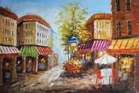 Współczesny obraz olejny o wyrazistej strukturze farby! Uliczka miejska wykonana za pomocą szpachli oraz pędzla. Kompozycja charakteryzująca się atrakcyjną stylistyką oraz ciepłymi kolorami!