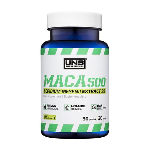 Suplement diety UNS Maca 500 to wysokiej jakości preparat, którego skład opiera się na wysokojakościowym ekstrakcie z MACA o bardzo wysokiej koncentracji wynoszącej aż 5:1, teraz dostępnym w formie wygodnych w użyciu tabletek! Już jedna porcja UNS Maca 500 dostarcza do naszego organizmu bogactwo aminokwasów, witamin i minerałów, wspierając tym samym ogólne zdrowie organizmu oraz wpływając pozytywnie na nasze samopoczucie! Stała suplementacja UNS Maca 500 zwiększa zakres zdolności seksualnych poprzez wzrost libido, oraz wspomaga funkcjonowanie układu hormonalnego, łagodząc bóle menstruacyjne kobiet, jak również dokuczliwe objawy menopauzy. Co więcej, preparat ten wspiera ponadto układ nerwowy, zwiększając zakres możliwości umysłowych, a także dodaje sił witalnych i zwiększa wytrzymałość! Produkt rekomendowany wszystkim osobom aktywnym fizycznie i sportowcom oraz intensywnie pracującym umysłowo!
