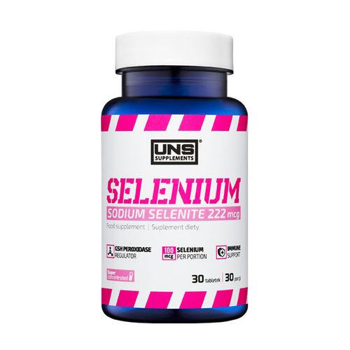Suplement diety UNS Selenium to wysokojakościowy preparat dostarczający bardzo dobrze przyswajalnego selenu, teraz dostępnego w formie poręcznych tabletek! Selen, jak jeden z mikroelementów, jest związkiem niezbędnym, aby nasz organizm mógł zachować zdrowie i prawidłowo funkcjonować. Wysoka aktywność antyoksydacyjna, którą odznacza się związek, ochrania komórki ciała przed szkodliwym działaniem wolnych rodników, jak również wspiera ich usuwanie z organizmu. Działanie to pozwala wzmacniać układ odpornościowy człowieka, a także zapobiega niepożądanemu rozwojowi wielu groźnych schorzeń, w tym również raka. Stała suplementacja UNS Selenium wpływa dodatkowo pozytywnie na pracę tarczycy oraz skutecznie zapobiega niekorzystnym niedoborom selenu w organizmie, wspierając tym samym nasze zdrowie! Produkt dostępny w postaci łatwych do połknięcia tabletek.