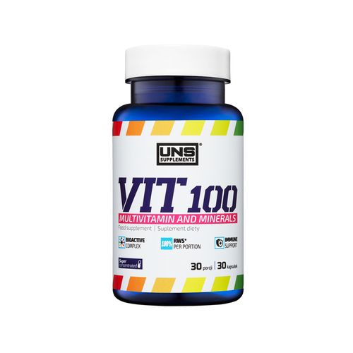 Suplement diety UNS Vit 100 to wysokojakościowy preparat, którego zawartość opiera się na kompleksie aż 13 różnych witamin i minerałów, których udział wspiera ogólne zdrowie organizmu i dba o nasze dobre samopoczucie! Preparat, dzięki tak zaawansowanej formule składników, pozwala pokryć 100% zapotrzebowania organizmu na każdy z obecnych w mieszance mikroelementów! Już jedna porcja UNS Vit 100 to bogactwo wartościowych mikroskładników o dobrej przyswajalności. Co więcej, produkt ten został stworzony z myślą o wszystkich osobach aktywnych fizycznie i sportowcach, których zapotrzebowanie na poszczególne witaminy i minerały jest większe, niż w przypadku osób biernych sportowo, przez co wspiera on utrzymanie najważniejszych funkcji życiowych na najwyższym poziomie oraz skutecznie zapobiega niepożądanym niedoborom wyżej wspomnianych substancji! Obecne w UNS Vit 100 witaminy z grupy B oraz witamina C, K, E i A efektywnie oddalają uczucie zmęczenia organizmu, ochraniają komórki ciała przed szkodliwym działaniem stresu oksydacyjnego, utrzymują zdrowie kości i stawów, wspierają prawidłową pracę układu nerwowego, oraz dbają o właściwy przebieg wielu procesów zachodzących w organizmie. Nie zastanawiaj się dłużej i kup UNS Vit 100 już dziś, a przekonasz się, czym jest zdrowie!