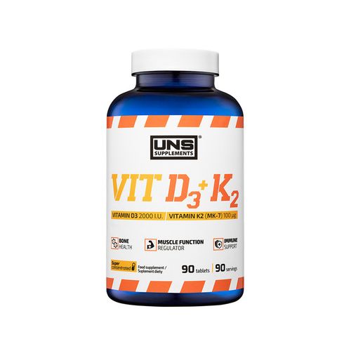 Suplement diety UNS Vit D3 K2 MK7 to wysokojakościowy preparat specjalnego użytku, którego skład opiera się na wysokiej zawartości dwóch cennych związków - witaminy D3 oraz K2 w formie MK7, teraz dostępnych w postaci łatwych do połknięcia tabletek! Preparat, dzięki tak zaawansowanej formule składników, wspomaga wchłaniania i wykorzystanie wapnia i fosforu, wpływając tym samym na zdrowie układu kostnego oraz zębów, oraz działa prewencyjnie przeciwko zaburzeniom mineralizacji kości i jej następstwom, jak osteoporoza. Dodatkowo, suplement uzupełnia ewentualne niedobory witamin D3 i K2, a także pomaga im zapobiegać w przyszłości, oraz wpływa na prawidłowe przekaźnictwo nerwowe i reguluje skurcz mięśni, ważny nie tylko w trakcie wysiłku. Właściwa podaż wapnia z zewnątrz wpływa także pośrednio na jakość naszych treningów, gdyż skraca ona czas regeneracji naszych mięśni, jak również wspiera zwiększanie wytrzymałości treningowej, związanej z prawidłową pracą układu mięśniowego, którego funkcjonowanie reguluje działanie obu amin - D3 i K2.