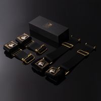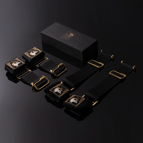 Pasy przytrzymujące zrobione są z wysokiej jakości nylonu. Mankiety na nadgarstki wykonane są z miękkiego, ale mocnego aksamitu. Mocne i wytrzymałe, czarno-złote paski do wiązania są łatwe w użyciu, ponieważ można regulować ich długość i napięcie. Elegancie wykończenie pięknymi metalowymi elementami nadaje luksusowy wygląd. Wszystkie części są galwanizowane.