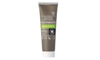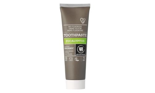Nazwa produktu: Urtekram. Pasta do zębów bez fluoru. EUKALIPTUS. Pojemność: 75 ml. Opis:Pasta do zębów pochodzi od wiodącego na duńskim rynku producenta eko- kosmetyków. Receptury kosmetyków tworzone są na podstawie naturalnych składników roślinnych bez udziału sztucznych konserwantów, barwników, zapachów, parabenów czy też produktów petrochemii. Skład pasty jest klarowny i krótki – kreda, gliceryna, agar, mirra i ekstrakt z eukaliptusa. Komponenty pochodzą wyłącznie z nadzorowanych upraw ekologicznych, nie były testowane na zwierzętach. Przeznaczenie: Do codziennej higieny zębów i jamy ustnej dla osób, które poszukują naturalnych składów w pastach do zębów bez szkodliwej chemii. Właściwości i cechy: Pasta do zębów z ekstraktem z eukaliptusa, to doskonała alternatywa dla tradycyjnych past, których składy są dłuższe niż książka telefoniczna. To co odczujesz jako pierwsze to przyjemny wyrazisty i jakby lekko słodki smak. Pasta zdecydowanie mniej się pieni od popularnych sklepowych past, ale znacznie lepiej od ekologicznej konkurencji. Po umyciu efekt świeżości i czystości jest komfortowy, długotrwały. Zawarta w składzie kreda doskonale doczyszcza płytkę. Zęby stają się jaśniejsze i zdrowsze a oddech odświeżony. Sposób użycia: Wyciśnij niewielką ilość pasty na szczoteczkę, umyj zęby tak jak zwykle, następnie opłucz usta wodą. Korzyści: Jakość kosmetyku zasługuje na szczególną uwagę przy wyborze pasty do zębów. Kosmetyk charakteryzuje się nie tylko przemyślanym i atrakcyjnym składem lecz również jest wydajny i został skomponowany z bezpiecznych, naturalnych surowców. Wyprodukowano w Danii.