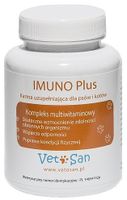 Vetosan IMUNO Plus stanowi zbalansowane połącznie witamin, minerałów oraz pierwiastków śladowych zapewniających skuteczne wzmocnienie odporności w okresie zwiększonego wysiłku i przy skłonnościach do zachorowań. Korzystnie wpływa na stymulację układu immunologicznego. Vetosan IMUNO Plus zalecany jest zwłaszcza dla psów karmionych mięsem, u których pomaga wyrównywać niedobory żywieniowe oraz dla samic ciężarnych i podczas laktacji. Poleca się również stosowanie preparatu w celu poprawienia kondycji psa lub kota oraz dla zwiększenia odporności organizmu starszych zwierząt.