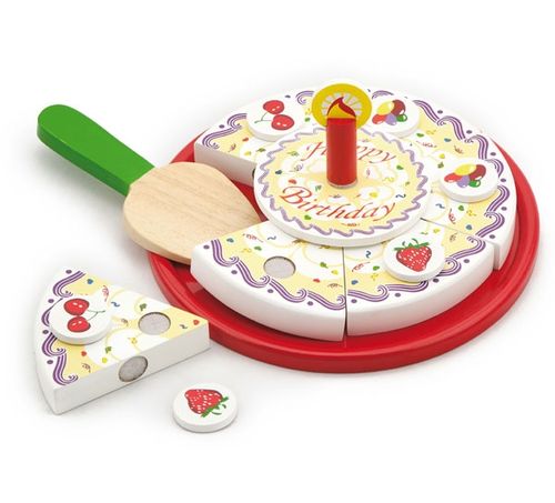 Drewniany Urodzinowy tort do krojenia Viga Toys Bezpieczny i kreatywny drewniany tort do krojenia składający się z 6 kawałków od firmy Viga to jedna z czołowych zabawek, która będzie służyła długo i zapewni Twojemu dziecku wiele lat ciekawej i kreatywnej zabawy. Kolorowy torcik cieszy oko i zachęca do zabawy. Zabawka zapewni cudowną zabawę podczas urodzinowego przyjęcia dla misia, laleczki czy koleżanki z przedszkola. Zestaw zawiera : - tort składający się z 6 kawałków połączonych rzepem oraz z górnego kawałka na środku - drewniany talerz - łopatkę do nakładania tortu - 6 elementów dekoracyjnych z truskawką, wisienką i lentilkami - świeczkę - 8 papierowych cyferek do nakładania na świeczkę w zależności od wieku. 23 x 3,5 cm od 18 mies.