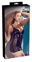Tight-fitting vinyl mini dress with a plunging neckline and a full-length zip at the front. It has an adjustable belt below the cleavage and transparent powernet inserts with lacing at either side. Adjustable straps.