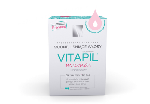 Suplement diety VITAPIL® mama został opracowany przez ekspertów z myślą o kobietach po porodzie, w okresie laktacji. Zalecany jest w celu uzupełnienia diety w substancje odżywcze i naturalną krzemionkę z bambusa. Składniki preparatu działają od wewnątrz – nie tylko na łodygę włosa, ale przede wszystkim na cebulkę i gruczoły łojowe. Sprawiają, że włosy stają się mocne, elastyczne i bardziej lśniące. Odpowiednio dobrane substancje aktywne m.in. biotyna, selen i cynk – pomagają zachować zdrowe włosy. Miedź pozytywnie wpływa na utrzymanie prawidłowej pigmentacji włosów. Cynk sprzyja właściwej syntezie białek włosa. Witamina B12, foliany oraz cynk – biorą udział w procesie podziału komórek, w tym cebulki włosa. Witamina A, cynk, jod oraz niacyna – pomagają zachować zdrową skórę głowy. Miedź i cynk – wspomagają ochronę komórek przed szkodliwym działaniem wolnych rodników i stresem oksydacyjnym, który powstaje podczas m.in. ekspozycji na słońce, mróz, farbowanie lub suszenie włosów. VITAPIL® mama został wzbogacony w kompleks AminQ2® – aminokwasy zawierające siarkę tj. L-metionina i L-cysteina. L-cysteina występuje w keratynie i jest głównym białkowym składnikiem włosów. Witamina B6 pomaga w prawidłowej syntezie tego aminokwasu. Krzem jest składnikiem strukturalnym włosów. Prawidłowa struktura włosów powoduje, że stają się one mocne i odporne na czynniki mechaniczne.