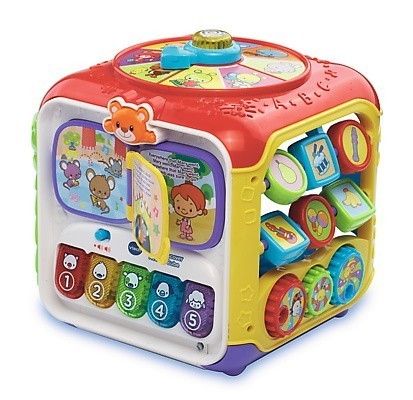 V-Tech Kostka aktywności- Posiada 6 kolorowych ścianek do zabawy.- Pianinko uczy cyferek, kolorów i odgłosów zwierząt.- Kolorowa książeczka z przewracanymi stronami wygrywa piosenki rymowanki.- Ruchoma strzałka na tarczy zegara obraca się, ucząc nazw zwierząt i przedmiotów.- Zabawka posiada kolorowe koraliki i zębatki oraz inne ruchome elementy, które zapewniają rozwój motoryczny małych rączek.Zabawka wymaga 2 baterii AA.Wiekod 9 miesięcy