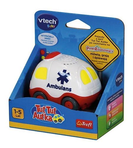 VTech - Autko AmbulansKażde pojedyncze autko samo w sobie jest świetną zabawką! Każde autko mówi, gra i śpiewa! Ergonomiczny kształt zaprojektowany został specjalnie dla małych dziecięcych rączek. Autka są kompatybilne. Można je łączyć z zestawami serii Tut Tut Autka. Autka reagują w Punktach Rozpoznających. Autka zostały stworzone z pasji i na potrzeby małych dzieci. Zabawki rozwijają kreatywność i wyobraźnię.Wiekod 12 miesięcy