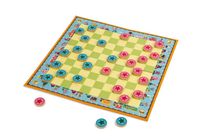 Warcaby francuskiej marki JANOD to wspaniała zabawa dla dwóch osób – zarówno dzieci, jak i dorosłych. Zestaw zawiera planszę, wykonaną z solidnego kartonu oraz drewniane elementy: 40 pionków – 20 różowych i 20 niebieskich. Zadanie polega na „zbiciu” wszystkich pionków przeciwnika. Wygrywa gracz, który zrobi to jako pierwszy.