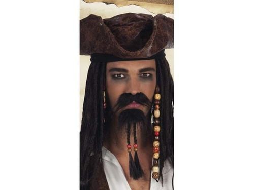 Wąsy pirat z brodą. Czarne długie wąsy oraz broda z warkoczykami ozdobionymi koralikami dla pirata do stylizacji pirackich podczas imprez karnawałowych.