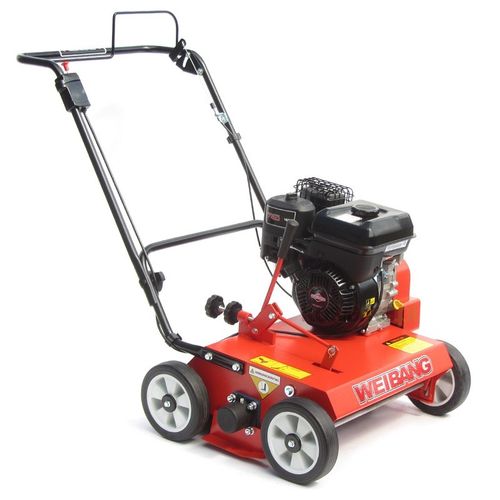 Główne zalety wertykulatora spalinowego Weibang WB486CRB: Amerykański, górnozaworowy silnik Briggs&Stratton 750 Series o mocy 5KM i pojemności 163cm³ (zbiornik paliwa 3,1L); Duża szerokość robocza 47cm z płynną, dźwigniową regulacją głębokości roboczej w zakresie 0 - 16mm; Optymalna wydajność wertykulacji dzięki 28 nożom uchylnym wykonanym z wysokogatunkowej stali węglowej (odległość między nożami 33mm); Maksymalny poziom bezpieczeństwa dzięki uchwytowi bezpieczeństwa na kierownicy – zwolnienie uchwytu powoduje zatrzymanie noży; Wysoka niezawodność pracy i łatwe serwisowanie dzięki wirnikowi zamontowanemu na łożyskach i łatwo dostępnym smarowniczkom w gniazdach łożysk; Zwarta, stalowa konstrukcja, solidne koła prowadzące z gumowymi oponami oraz podwójny pasek napędowy z napinaczem gwarancją bezawaryjnej i wieloletniej eksploatacji. Nazwa produktuWertykulator spalinowy Weibang WB486CRBMarka silnikaBriggs&StrattonModel silnika750 OHVTyp silnikaspalinowy czterosuwowyMoc silnika (KM)5Pojemność silnika (cm³)173Pojemność zbiornika oleju (L)0.6Pojemność zbiornika paliwa (L)1.0RozruchręcznySzerokość robocza (cm)47KorpusstalGłębokość robocza min - max (cm)0 - 1.6Ilość noży28Poziom hałasu (dB)99Waga (kg)55.3Gwarancja konsument24 miesiące