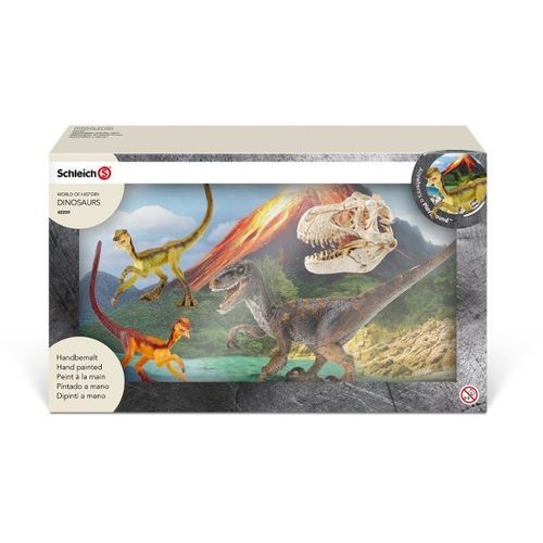 Zestaw Welociraptor na polowaniu zawiera: Welociraptora z ruchomą dolną szczęką, 2 figurki Kompsognatów, szkielet czaszki T-rexa.