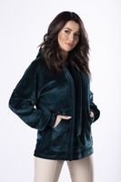 Klasyczna, casualowa bluza o prostym kroju z dużą, naszytą kieszenią z przodu typu kangurka. Całość wykonana z miękkiego weluru z delikatnym połyskiem na całości. Z tyłu obszerny kaptur z praktycznymi ściągaczami z możliwością regulacji. Długie, bufiaste rękawy z wyraźnie obniżoną linią ramion. Długość sięgająca za linię bioder. Model bez podszewki. Bluza sprawdzi się w stylizacjach o codziennym, sportowym charakterze. Modelka ma 173 cm wzrostu i prezentuje egzemplarz w rozmiarze 36/S.