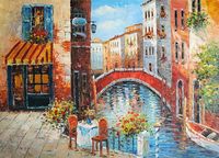 Niepowtarzalny pejzaż wenecki! Obraz olejny w cudownej kolorystyce. Wyrazista faktura pracy, osiągnięta poprzez użycie szpachli malarskiej. Oryginalna dekoracja wnętrz!