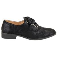 Czarne, eleganckie półbuty Juliet wykonane zostały z materiału. Wiązane na ozdobne czarne sznurowadła przypominające wstążkę. Podeszwa z tworzywa sztucznego jest wyjątkowo wygodna dla stopy, dzięki bieżnikowi który pozwala zachować sprężystość kroków. Zabudowany, miękki zapiętek i plaski obcas czynią te buty wyjątkowo wygodnym.