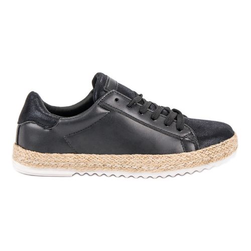 Czarne Wiązane Trampki Espadryle to bardzo ciekawy wybór na buty casualowe. Wykonane są z materiału ekologicznego, który świetnie imituje skórę licową, dodatkowo zaopatrzone są we wstawki z pasków zamszowych. Ciekawie wykonana jest podeszwa butów, która dekorowana jest paskiem z plecionki, który zapewnia im niepowtarzalny charakter.