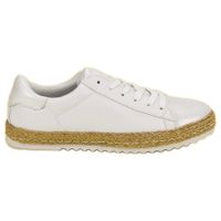 Wiązane Trampki Espadryle w kolorze białym to bardzo estetyczne, casualowe buty, które mogą również znaleźć zastosowanie w bardziej śmiałych, eleganckich kreacjach. Buty wykonano z wysokiej jakości skóry ekologicznej i nadano im kształt klasycznych trampków. Podeszwa butów ozdobiona jest plecionką ze sznurka, co nadaje im ciekawego wyglądu.