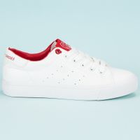 Trampki białe z czerwonymi detalami to wygodne sportowe obuwie na co dzień. Buty są lekkie, wykonane z naturalnej, przepuszczającej powietrze tkaniny, nie ocierają ani nie obciskają. Ich atutem jest mocna, ale elastyczna i nie blokująca ruchów podeszwa, a także miękko wykończona wyprofilowana wkładka.