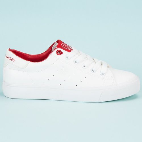 Białe trampki wiązane J. Star to ciekawe i nowoczesne obuwie dla każdej modnej kobiety. Trampki są idealnym dopełnieniem casualowej stylizacji. Buty posiadają czerwone wnętrze - obramowanie ożywia ich stylistykę i sprawia, że trampki prezentują się naprawdę ciekawie. Wiązane obuwie jest nie tylko modne, ale również wyjątkowo wygodne.
