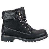 Czarne trapery damskie na sezon jesienno-zimowy. Buty wiązane z dodatkowymi zaczepami na sznurówki, ułatwiającymi zakładanie i zdejmowanie. Trapery o klasycznym kroju, ich charakterystyczny element to cholewa nad kostkę obszyta czarnym, błyszczącym na srebrno materiałem i białymi przeszyciami. Wybierz swój rozmiar i kup teraz!