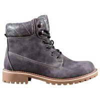Trapery damskie wykonane z tworzywa skóropodobnego w szarym kolorze, doskonale sprawdzą się podczas chłodniejszych dni, chroniąc stopy przed zimnem dzięki ocieplonemu wnętrzu. Buty te mają sznurowane cholewki sięgające za kostkę, solidne podeszwy z protektorem, a także wygodny szeroki obcas o wysokości 3 cm.