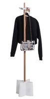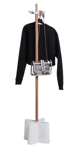 Wieszak Clover to praktyczny mebel składający się ze stabilnej podstawy i czterech uchwytów na odzież, wykonanych z polipropylenowego tworzywa. Posiada możliwość przechowywania parasolek oraz m.in. łyżek do obuwia. Całość spina solidny trzon, wykonany z jasnego drewna. Produkt dostępny w dwóch wariantach kolorystycznych: czarnym i białym. Wysokość: 158