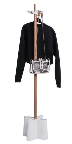 Wieszak Clover to praktyczny mebel składający się ze stabilnej podstawy i czterech uchwytów na odzież, wykonanych z polipropylenowego tworzywa. Posiada możliwość przechowywania parasolek oraz m.in. łyżek do obuwia. Całość spina solidny trzon, wykonany z jasnego drewna. Produkt dostępny w dwóch wariantach kolorystycznych: czarnym i białym.Wysokość: 158Szerokość: 27,5Głębokość: 27,5