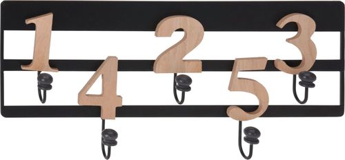 Digits to nie tylko funkcjonalny wieszak do przedpokoju, ale również może pełnić funkcję wieszaka w łazience. Metalowy wieszak z ozdobnymi drewnianymi cyframi z pewnością zauroczy wszystkich ceniących połączenie funkcjonalności oraz stylu. Dbałość o szczegóły oraz staranne wykonanie sprawia, że całość prezentuje się estetycznie i bardzo efektownie. To nie tylko użyteczny przedmiot, ale także piękna ozdoby ścienna w przedpokoju czy sypialni. Pięć wystających haczyków zostało tak uformowanych, by z łatwością zawiesić na nich zarówno drobne elementy, np. klucze, oraz nieco większe jak i cięższe np. odzież wierzchnią. Produkt wykonany jest z metalu w kolorze czarnym, pomalowanym metodą proszkową oraz drewnianych cyfr w kolorze naturalnym. Wieszak dopełni aranżacje w stylu rustykalnym czy skandynawskim. Wysokość: 16