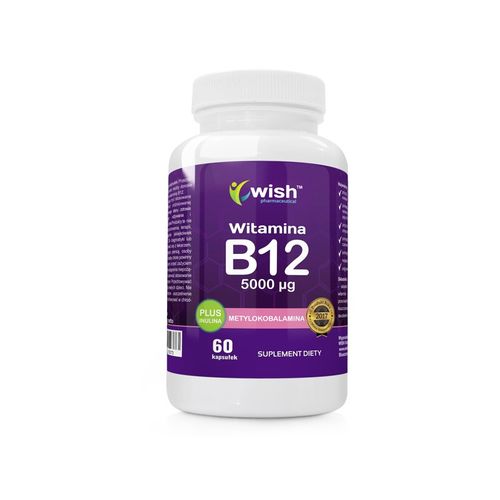 Suplement diety Wish Witamina B12 5000 mcg to wysokiej jakości preparat, którego skład opiera się na optymalnej dawce witaminy B12, znanej także jako kobalamina, wynoszącej aż 5000 mcg już w jednej porcji. Witamina B12 spełnia w organizmie ludzkim szereg ważnych zastosowań, jak również wpływa na ogólną poprawę zdrowia organizmu. Stałe przyjmowanie preparatu Wish Witamina B12 5000 mcg zapobiega wszelkim niedoborom witaminy B12 w organizmie, a ponadto wspiera utrzymanie prawidłowego metabolizmu energetycznego. Co więcej, środek ten wpływa również korzystnie na stan układu nerwowego, przyczyniając się do wzrostu zdolności intelektualnych i poprawiając koncentrację, oraz wspiera utrzymanie prawidłowych funkcji psychologicznych organizmu. Dodatkowo, witamina B12 obecna w środku Wish Witamina B12 5000 mcg wzmacnia układ odpornościowy, bierze czynny udział w procesie produkcji cysteiny oraz wzmacnia stan czerwonych krwinek. Produkt dostępny w postaci łatwych do połknięcia kapsułek.