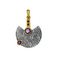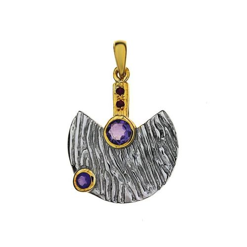 Interesujący, oryginalny wisiorek wykonany w całości ze srebra najwyższej próby 0,925, częściowo pozłacanego. Wisiorek ozdobiony naturalnymi kryształami w kolorze ametystu i małymi, naturalnymi rubinkami. Wymiary: Długość wyrobu z zawieszką: 4 cmSzerokość wyrobu: 2.8 cmPrzybliżona waga: 7.8 gram Doskonała jakość wykonania gwarantowana. Do każdego produktu dodajemy eleganckie pudełko i metkę jubilerską z pustym miejscem na cenę - tak przygotowana biżuteria staje się idealnym prezentem.