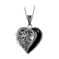 Staviori Wisiorek. Onyks. Markazyty. Srebro 0,925. Długość 22 mm. Szerokość 22 mm. Grubość 9 mm. Wysokość 32 mm. Otwierane puzderko z miejscem na zdjęcie.