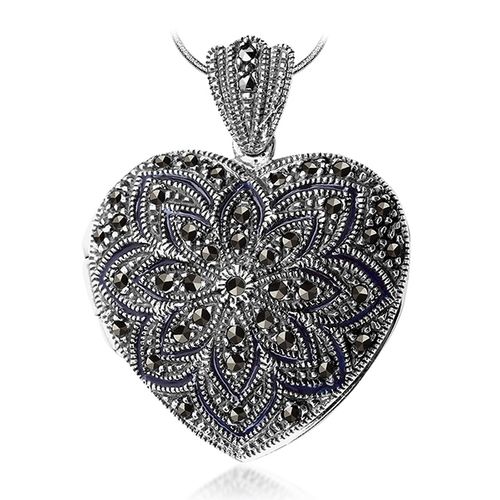 Staviori Wisiorek. Emalia. Markazyty. Srebro 0,925. Długość 28 mm. Szerokość 30 mm. Grubość 11 mm. Wysokość 40 mm. Otwierane puzderko z miejscem na zdjęcie.