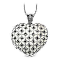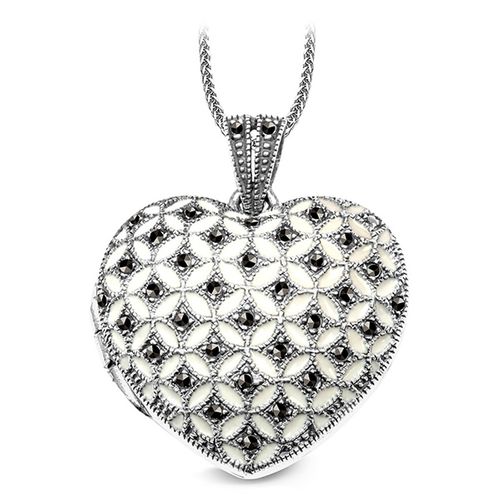 Staviori Wisiorek. Emalia. Markazyty. Srebro 0,925. Długość 27 mm. Szerokość 30 mm. Grubość 13 mm. Otwierane puzderko z miejscem na zdjęcie. Łańcuszek widoczny na zdjęciu to model LDX1944