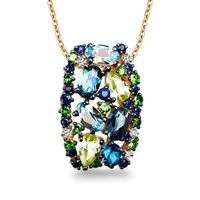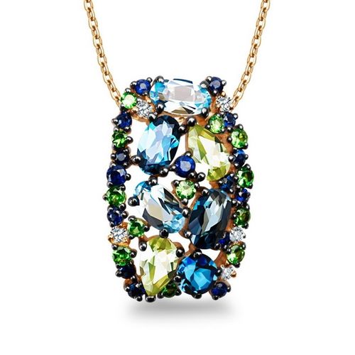 Staviori Wisiorek. 5 Diamentów, szlif brylantowy, masa 0,04 ct., barwa H-I, czystość SI1-SI2. 15 Szafirów, masa 0,23 ct.. 2 Perydoty, masa 0,43 ct.. 5 Topazów błękitnych, masa 1,25 ct.. 11 Garnetów zielonych, masa 0,20 ct.. Żółte Złoto 0,585. Model ozdobiono: 5 szt. brylantami w jakości I+/SI o łącznej masie 0,04 ct. 3 szt. London Blue Topaz o łącznej masie 0,74 ct. 2 szt. Blue Topaz o łącznej masie 0,51 ct. 2 szt. Peridot o łącznej masie 0,43 ct. 11 szt. Green Carnet o łącznej masie 0,20 ct. 15 szt. Szafir o łącznej masie 0,23 ct. Autentyczność kamieni szlachetnych potwierdzona Certyfikatem