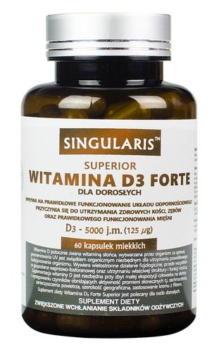 Suplement diety WITAMINA D3 5000 IU SUPERIOR jest naturalnym i cennym źródłem 100% witaminy D3 z lanoliny. Preparat zawiera 125 µg naturalnej witaminy D w postaci cholekalcyferol w jednej kapsułce. Witamina zawieszona została w oleju sojowym* nośniku gwarantującym najwyższą wchłanialność i skuteczność działania. Wysoka dawka witaminy D3 ma udowodnione fizjologiczne oddziaływania na ludzki organizm. Substancja czynna została zamknięta w łatwej do połknięcia kapsułce żelowej. Przeznaczony jest dla osób dorosłych i młodzieży po 12 roku życia.