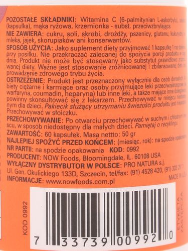 | | | | Składniki: |  | Witamina C (z palmitynianu askorbylu) 2 mg 3%, Witamina K2 (w postaci Menachinonu-7) (MK-7) (z natto) (soja) 100 µg 125%, Mąka ryżowa, celuloza (kapsułka), żelatyna, palmitynian askorbylu oraz krzemionka.