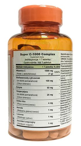 Kwas L-askorbinowy (witamina C), bioflawonoidy cytrusowe, rutyna, hesperydyna, dzika róża, acerola, lucerna, jęczmień zwyczajny, celuloza roślinna, fosforan dwuwapniowy, sole magnezowe kwasów tłuszczowych, krzemian wapnia, roślinny kwas stearynowy.