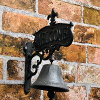 Metalowy pomalowany na rdzę dzwonek ścienny z literami „WELCOME” i „Fleur-de-lis” na górze. Maksymalna głębokość od ściany wynosi 22 cm, a maksymalna wysokość 24 cm. Podstawowa średnica dzwonka wynosi 11 cm. W zestawie znajduje się sznurek do dzwonka. Do instalacji potrzebne są 3 śruby do zawieszenia. "