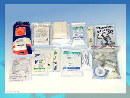 Wkład do apteczki W1 wyposażenie opatrunek osobisty (1szt.), opaska dz. 4x5 (4szt.), opaska dz. 4x10 (4szt.), opaska 4x15 (1 szt.) wata 50 g, chusta trójkątna (2szt.), plaster z gazą 1mx6cm, nożyczki, rękawice gumowe (4szt.) ustnik do sztucznego oddychania, koc termoizolacyjny, opaska elastyczna, zestaw do płukania oka kompresy bawełniane 5x5, 7x7, 9x9 (po 1 op.), gaza opatrunkowa, poloplast, instrukcja pierwszej pomocy Cena dotyczy 1 wkładu Czas realizacji zamówienia do 7 dni