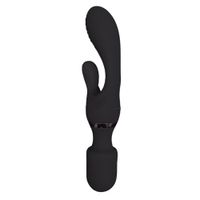 Ekskluzywny i piękny wibrator 2w1 przeznaczony do wykonywania zmysłowego masażu łechtaczki lub stymulacji punktu G. Wibrator został zaprojektowany, w taki sposób, by jego używanie było przyjemne, wygodne i komfortowe. Z jednej strony masażer typu wand z silikonową, wibrującą główką, przeznaczony dla najbardziej wymagających lubiących mocne doznania. Główka masażera jest duża, gładziutka nadająca się do bardzo intensywnej stymulacji zarówno klitorisu jak i sromu. Z drugiej strony mamy wibrator z stymulatorem łechtaczki i specjalną zakrzywioną głową do stymulacji w punkcie G. Dodatkowo w stymulatorze znajduje się wbudowany silniczek, dzięki któremu stymulacja łechtaczki jest jeszcze intensywniejsza. Urządzenie posiada 3 silniczki, które pobudzą ściany pochwy, punkt G i łechtaczkę. 3 silniki i 7 trybów wibracji na każdym końcu, dzięki czemu możesz stopniowo zwiększać i zmieniać swoje doznania lub od razu zdobyć szczyt mocnej rozkoszy. Warstwa wierzchnia urządzenia pokryta jest najwyższej jakości silikonem klasy medycznej, bezpiecznym, bezzapachowym nie odbarwiającym się.