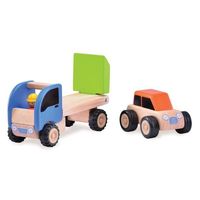 W zestawie jest laweta o gumowych kółkach, kierowca i małe autko, które może wjeżdżać i zjeżdżać po ruchomej pochylni.