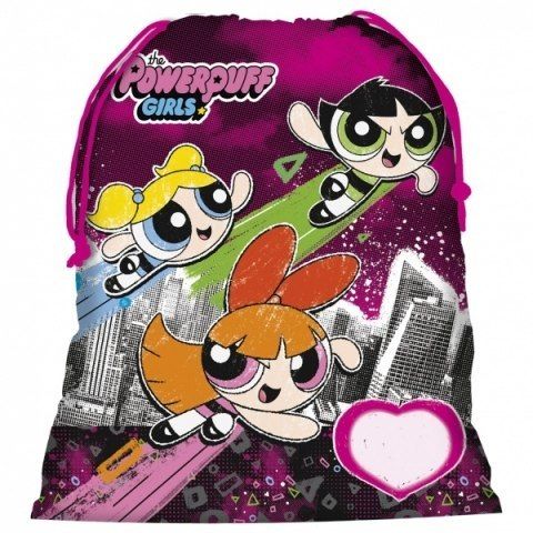 Worek utrzymany w różowej kolorystyce z postaciami Atomówek