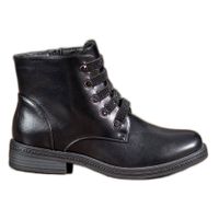 Buty wykonano ze skóry ekologicznej w czarnym kolorze co ułatwia ich dopasowanie do różnych kreacji. Wysokie wiązanie zapewnia dobre utrzymywanie się butów na nodze.