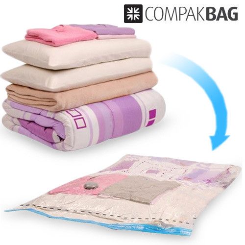 Narzekasz na brak miejsca w szafie? Nie wiesz gdzie wcisnąć koce, ręczniki, kurtki zimowe? Mamy coś, co może rozwiązać ten problem – worki próżniowe Compak Bag. Włóż do worka ubrania, odessij odkurzaczem powietrze i gotowe. Odessane worki zajmują aż 75% mniej miejsca. Na tak spakowanie koce i ubrania znajdziesz miejsce wszędzie – nawet pod łóżkiem!