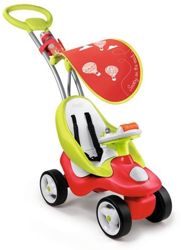 SMOBY Wózek Bubble Go czerwony 720103 Jeździk wielofunkcyjny Bubble Go rośnie wraz z dzieckiem. Dzięki akcesoriom znajdującym się w zestawie, może pełnić kilka fantastycznych funkcji, wpływjących na rozwój fizyczny i koordynację ruchową Maluszków. Najmłodsze dzieci (ok. 6 - 15 miesiąca) mogą używać autko jako jeździk, w którym dzięki stabilnej, mocnej rączce mogą być wożone przez rodziców. Są wtedy całkowicie bezpieczne, dzięki zastosowaniu wysokiego siedziska i pasów bezpieczeństwa. Wyprofilowane podnóżki gwarantują komfort małym nóżkom, a dodatkowe akcesoria, takie jak daszek, czy wydająca dźwięki kierownica - urozmaicają dziecku zabawę i chronią przed słońcem. Kiedy dziecku znudzi się już bierne siedzenie w autku (16 miesięcy), wysokie siedzisko można zdemontować, odczepić rączkę dla rodziców i zabawka zamienia się w idealny do zabawy, napędzany nóżkami - pojazd. Komfort podczas użytkowania zapewniają dodatkowo ciche koła i mocowany na pałąku uchwyt na napój. Pod siedziskiem znajduje się schowek na drobiazgi. Zabawka dla dziecka: brak + Zasilanie: 3 x LR44 (w zestawie) Wymiary zabawki: 63 x 35 x 55 cm Wymiary opakowania: 38,00 x 68,00 x 39,00 cm Waga (z opakowaniem): 5,60 kg