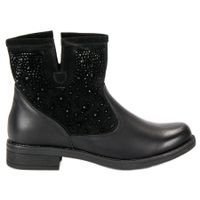 Wsuwane czarne botki to propozycja dla pań lubiących styl rockowy, przeznaczone do codziennego noszenia w sezonie jesienno-zimowym. Buty te zrobione są ze skóry ekologicznej, natomiast bieżnikowana podeszwa z tworzywa sztucznego. Sięgające za kostkę, na płaskim obcasie, z okrągłymi noskami oraz ozdobnymi kryształkami.