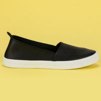 Wygodne i eleganckie czarne trampki, wykonane z ekologicznej skóry z białą, gumową podeszwą. Ozdobione na boku delikatną, subtelną gwiazdką. To codzienne buty dla kobiety, która ceni wygodę. Pasują zarówno do spodni, jak i do sportowej sukienki. Wsuwane, z miękkim, zabudowanym zapiętkiem, wygodne do noszenia na bose stopy. Idealne na lato.