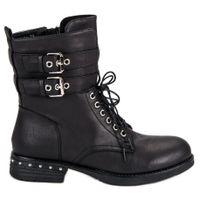 Wygodne botki damskie workery Super Me w kolorze czarnym. Buty zapinane na suwak, ze sprzączką i sznurowaniem. Mają płaski obcas o wysokości 4 cm. Wykonano je ze skóry ekologicznej. Ich ocieplenie stanowi futerko, wkładka ze skóry ekologicznej. Idealne na co dzień jako uzupełnienie zarówno rockowych, jak i casualowych stylizacji.