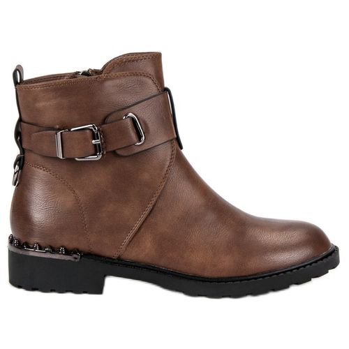 Damskie workery od marki Groto Gogo. Buty wykonane z wysokiej jakości skóry ekologicznej w brązowym kolorze. Workery zapinane są na zamek z cholewką o wysokości sięgającej ponad kostkę, która została dodatkowo ozdobiona skórzanym paskiem oraz klamrą. Buty na jesień i zimę, doskonałe do stylizacji w rockowym stylu.